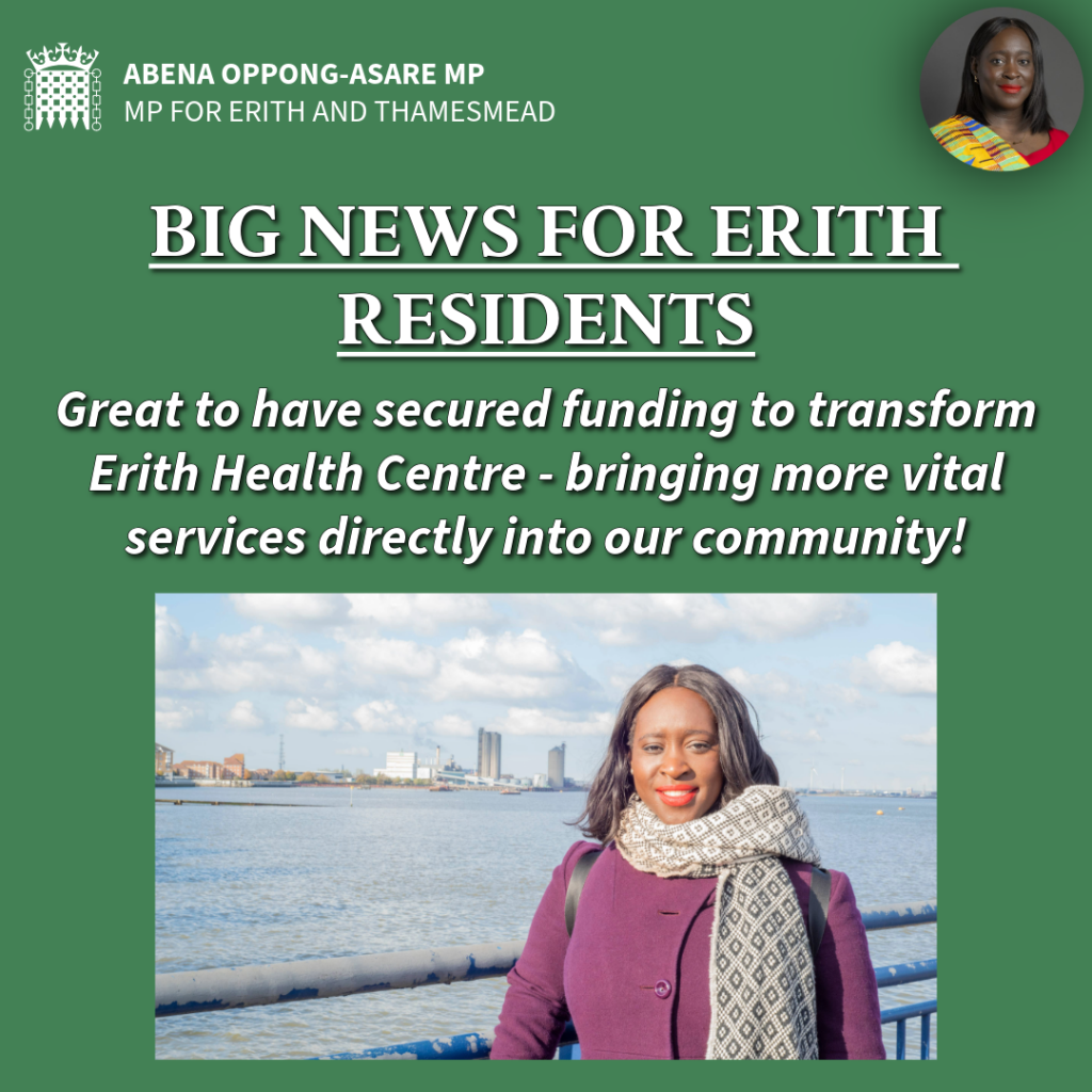 Erith and Thamesmead’s MP Abena Oppong-Asare has welcomed today’s announcement, which means an upgrade to Erith Health Centre. The investment means Erith is at the forefront of the government’s drive to shift healthcare from hospitals to communities.